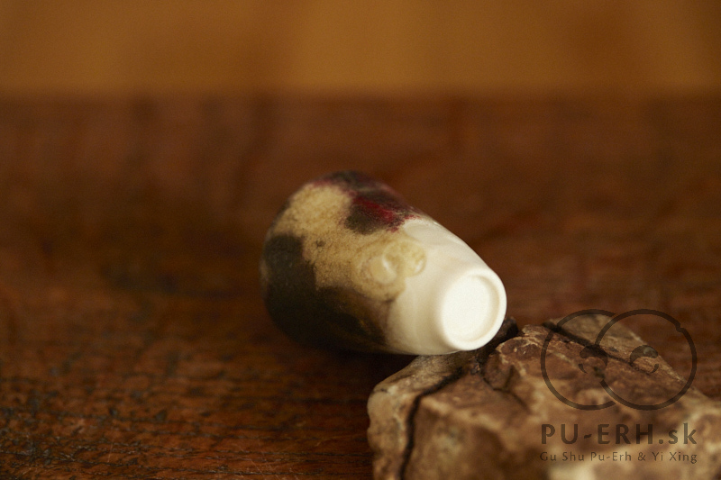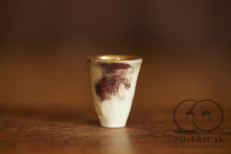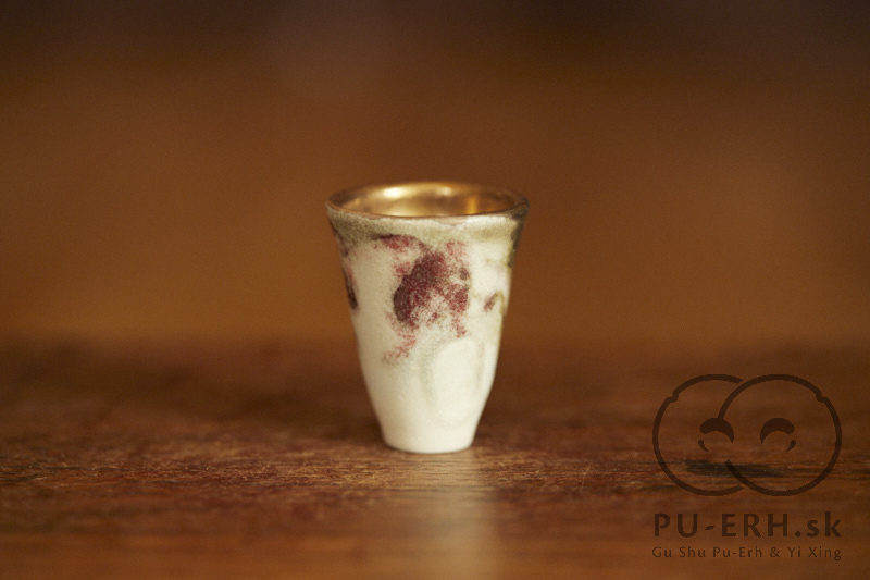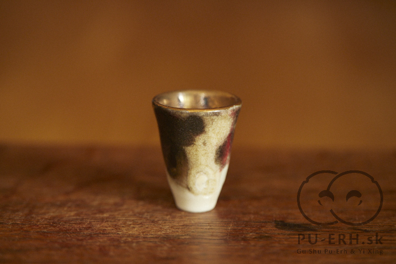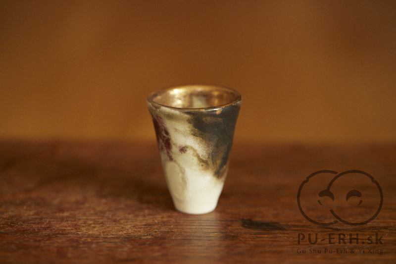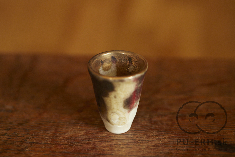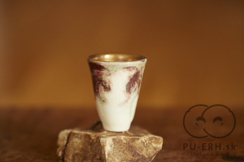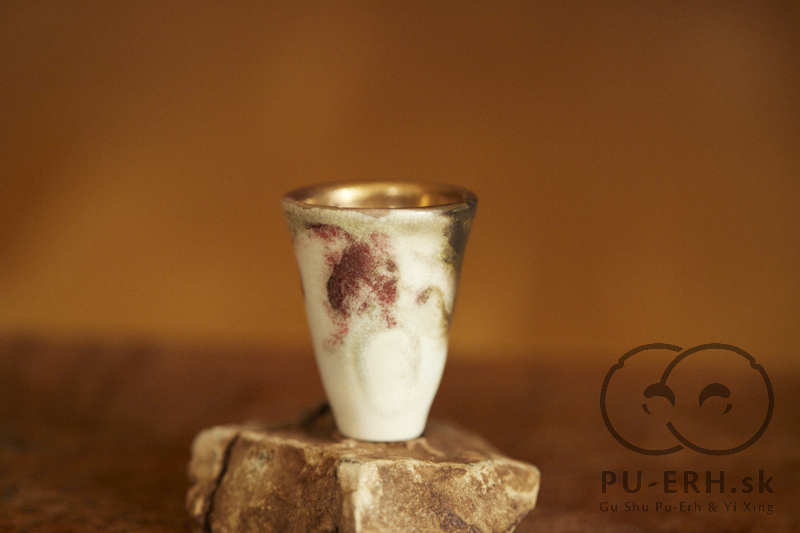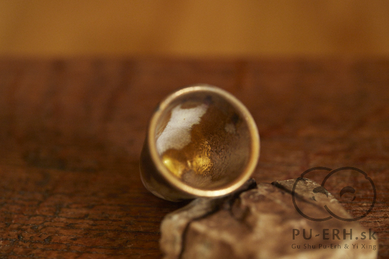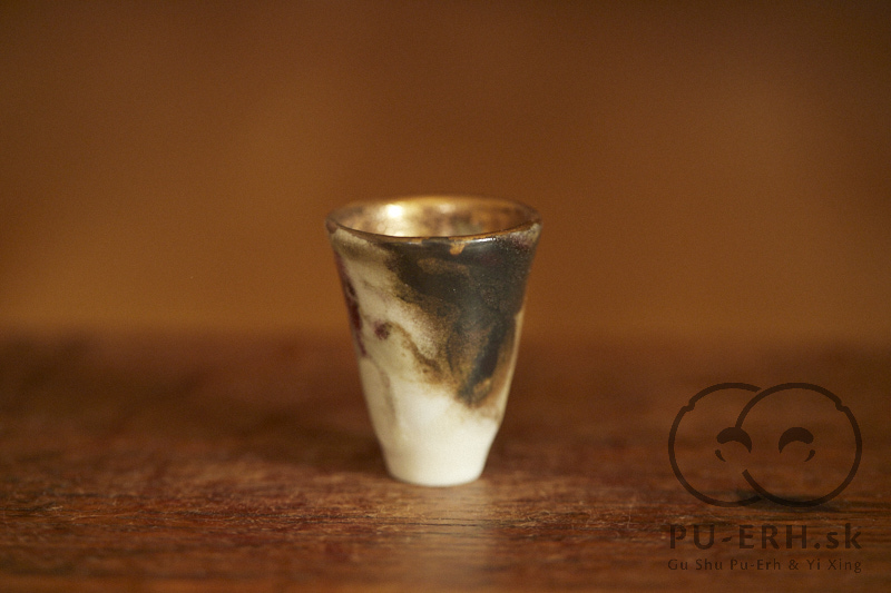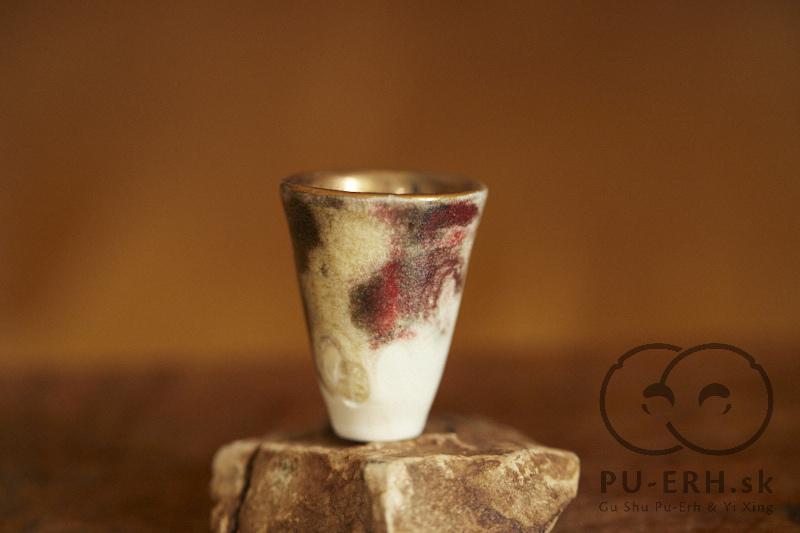 A tiny porcelain teacup with a tea-ash glaze, finished with 24k gold. Delicate and tall in proportion, this small cup carries rare glaze tones born from gas firing. Deep, dark hues—infused with tea leaves—shift subtly beneath a luminous gold finish, creating a surface that feels both organic and precious. Some of the leaves used in the glaze come from Lao Banzhang, shared and enjoyed during our stay on Rasa Mountain last year.