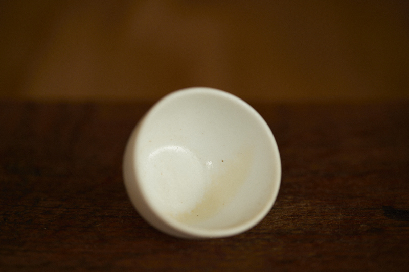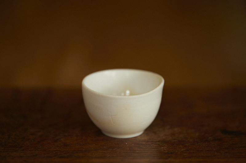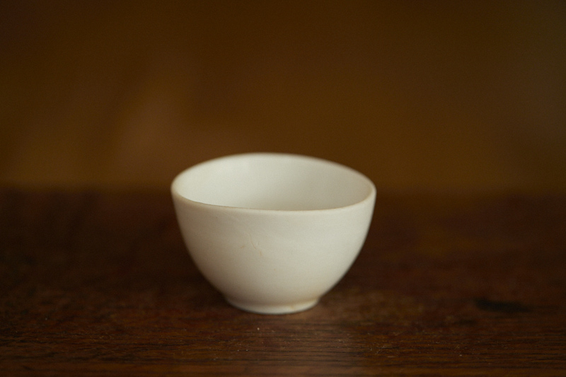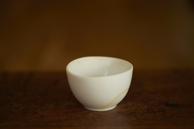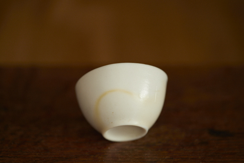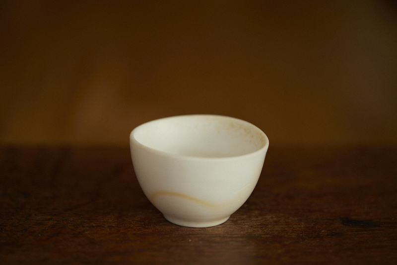 A ming porcelain woodfired teacup with a subtle glass glaze drop flow, wood fired at cone 12* .